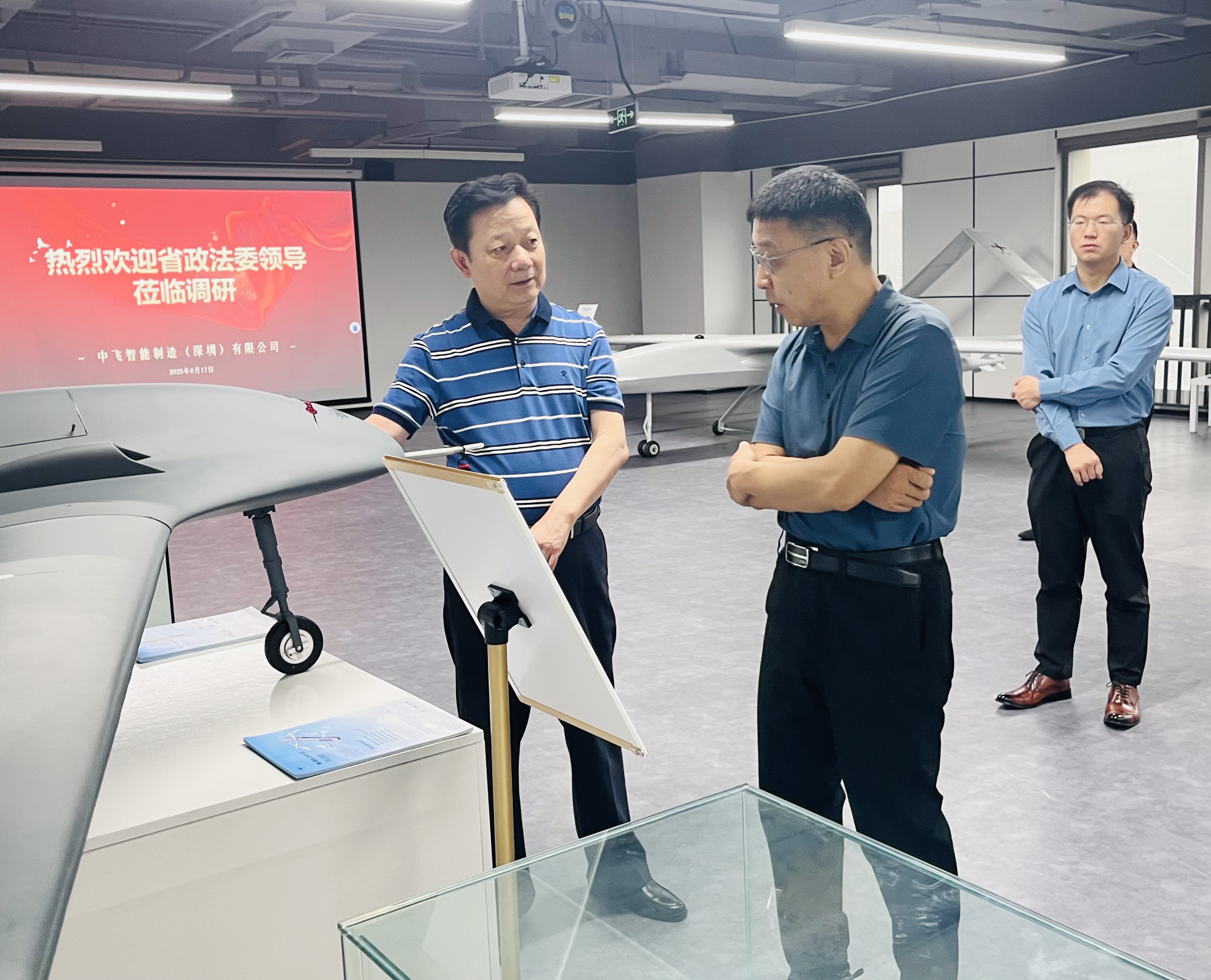 6月17日上午,广东省省委政法委副书记、新疆驻广东省工作组党委书记王奕文一行,在盐田区区委政法委副书记张长青陪同下莅临我司考察调研,我司中飞智能制造(深圳)有限公司董事长李维福及管理团队热情接待。此次调研不仅体现了省领导对我司的深切关怀,也展现了对低空经济这一新兴产业的高度重视。