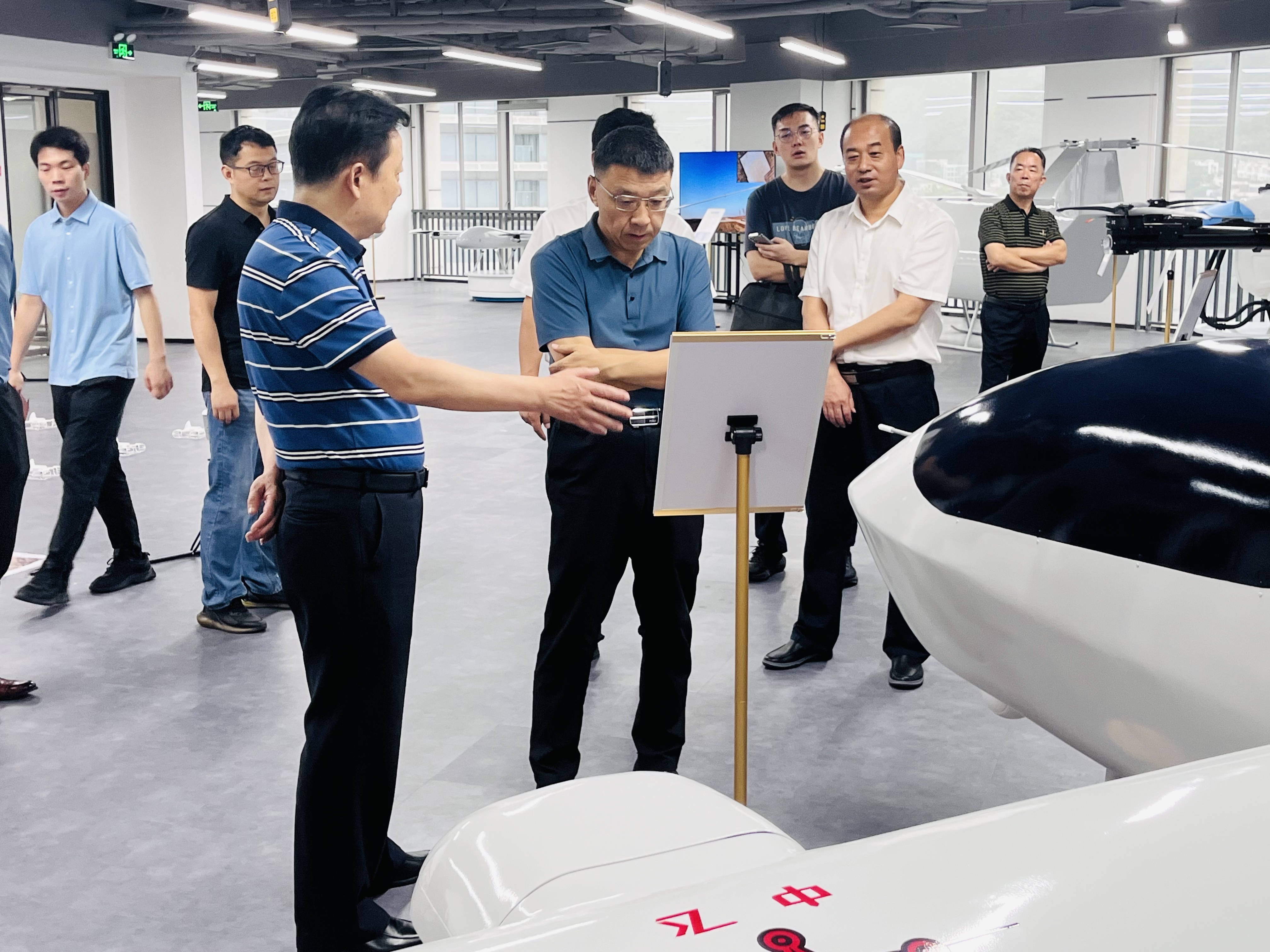 王奕文副书记认真听取汇报,不时驻足观看,对公司自主研发的中小型长航时固定翼无人机、纵列式大载重无人机表现出浓厚兴趣,并详细询问了技术参数、应用场景和市场反馈。